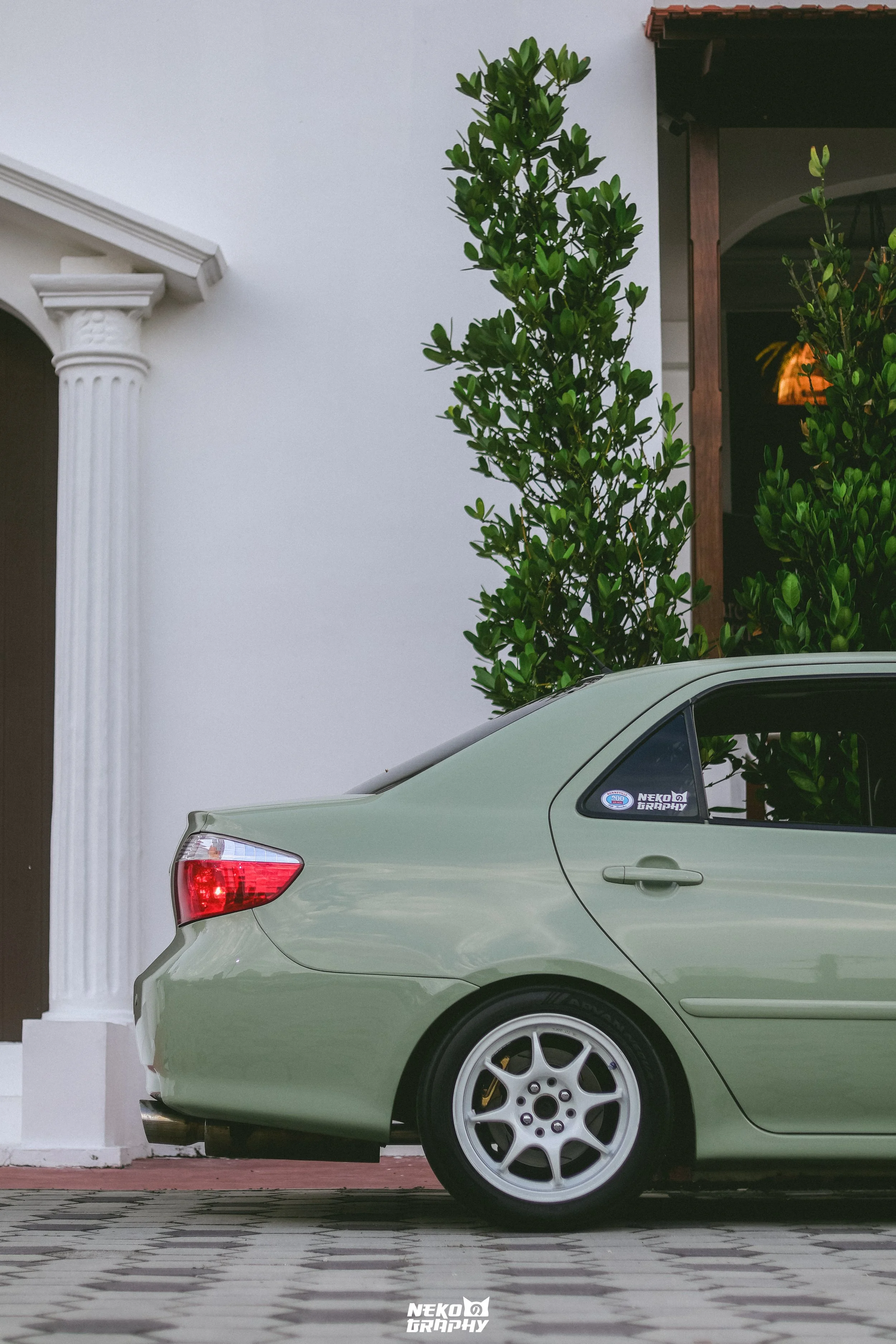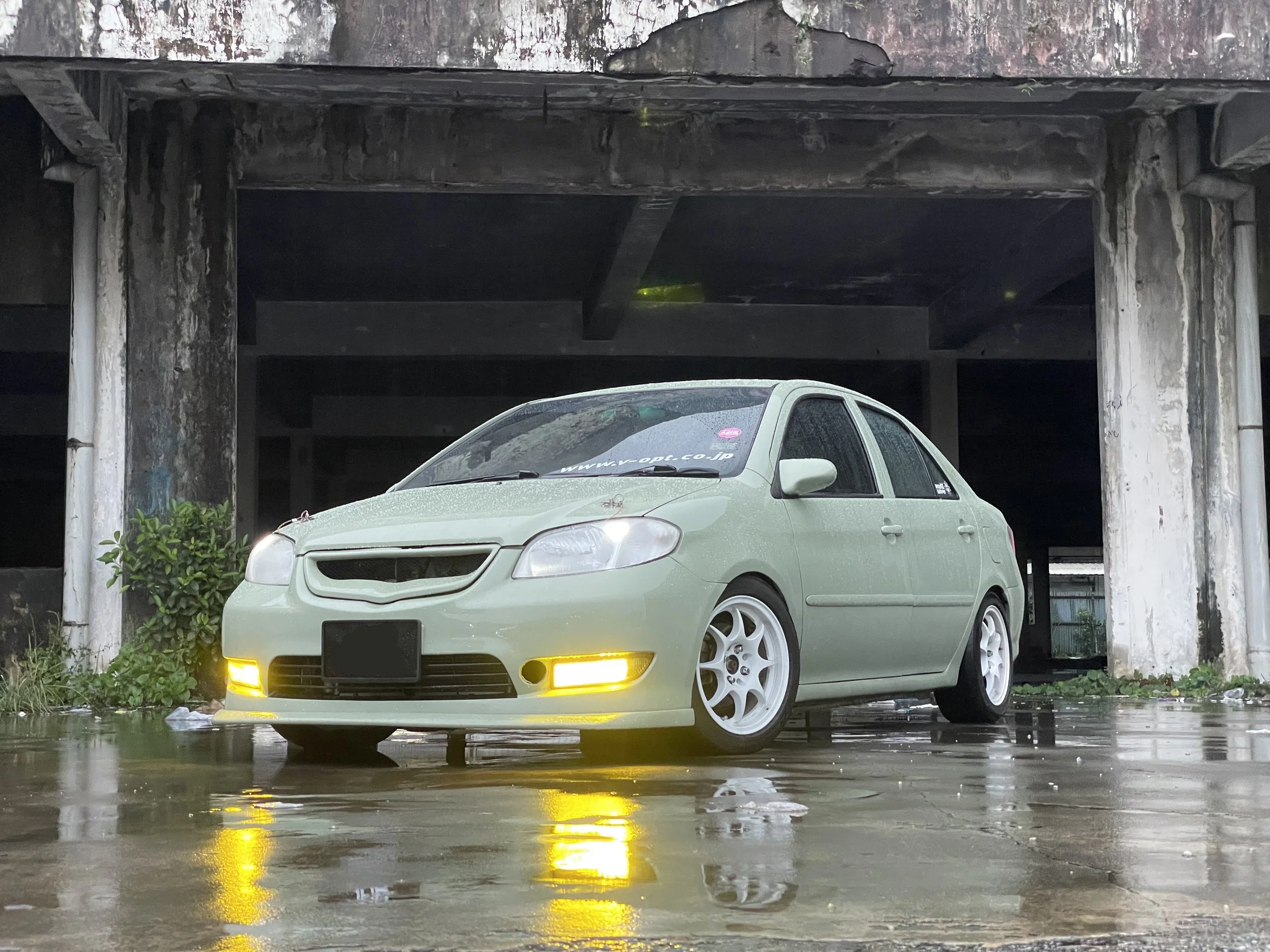 The exterior is unmistakable. Painted in a unique khaki green, the Vios grabs attention without being loud. A custom front lip, hood pins, and JTCC-style side mirrors nod to classic touring car influences, while 15-inch WedsSport TC05 wheels wrapped in Yokohama Advan AD09 tires complete the aggressive stance and track-ready look.